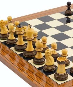 L’ensemble Burnt Echiquier en Bois d’Anegre et Bois de Rose & Jeu d’Echecs en Bois de Buis Brûlé est un produit haut de gamme, de fabrication européenne. L’échiquier mesure 50 x 50 cm, avec des cases de 5 cm de côté, et est fait de bois d’anegre et de rose doré, avec une finition brillante. Le jeu d’échecs est entièrement sculpté et ciselé à la main avec un bois de buis brûlé. Les pièces comportent 34 pièces, dont 32 pièces et 2 reines, avec une hauteur du roi de 10 cm et un diamètre de base de 4 cm. Le jeu est également fourni avec une base feutrée. La combinaison du bois d’anegre et de bois de rose doré, ainsi que le bois de buis brûlé donnent à cet ensemble un look unique et irrépro