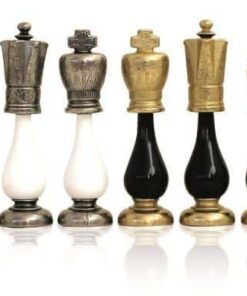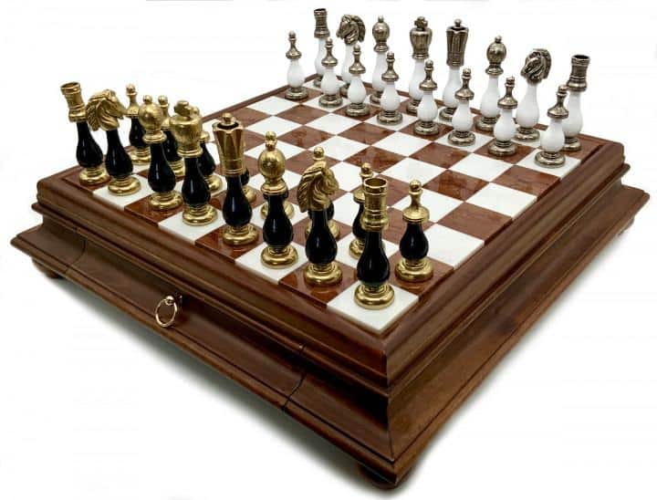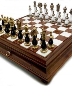 Ensemble d’Echecs Bicolore III – Echiquier en Bois et Plateau en Albâtre et Pièces en Métal et Bois – Noir et Blanc
