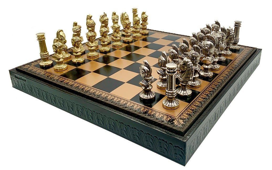 L’ensemble Bustes Romains II Echiquier avec Rangement et Jeu d’Echecs en Métal est un jeu intemporel. L’échiquier est fabriqué en Europe à partir de similicuir noir de qualité supérieure et mesure 48 x 48 x 5,5 cm, avec des cases de 5,2 cm. La finition est faite à la main et comprend un compartiment de rangement intégré. Les pièces du jeu d’échecs sont conçues en métal massif, avec des rois mesurant 9,8 cm de haut et 3,1 cm de diamètre de base. Chaque pièce est sculptée et ciselée à la main. L’ensemble comprend 32 pièces. Ce jeu élégant est parfait pour les passionnés d’échecs et les collectionneurs. Vous serez conquis par la qualité et le style de cet ensemble. Achetez-le aujourd’hui et prof