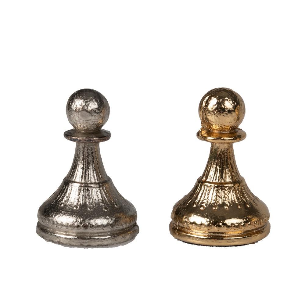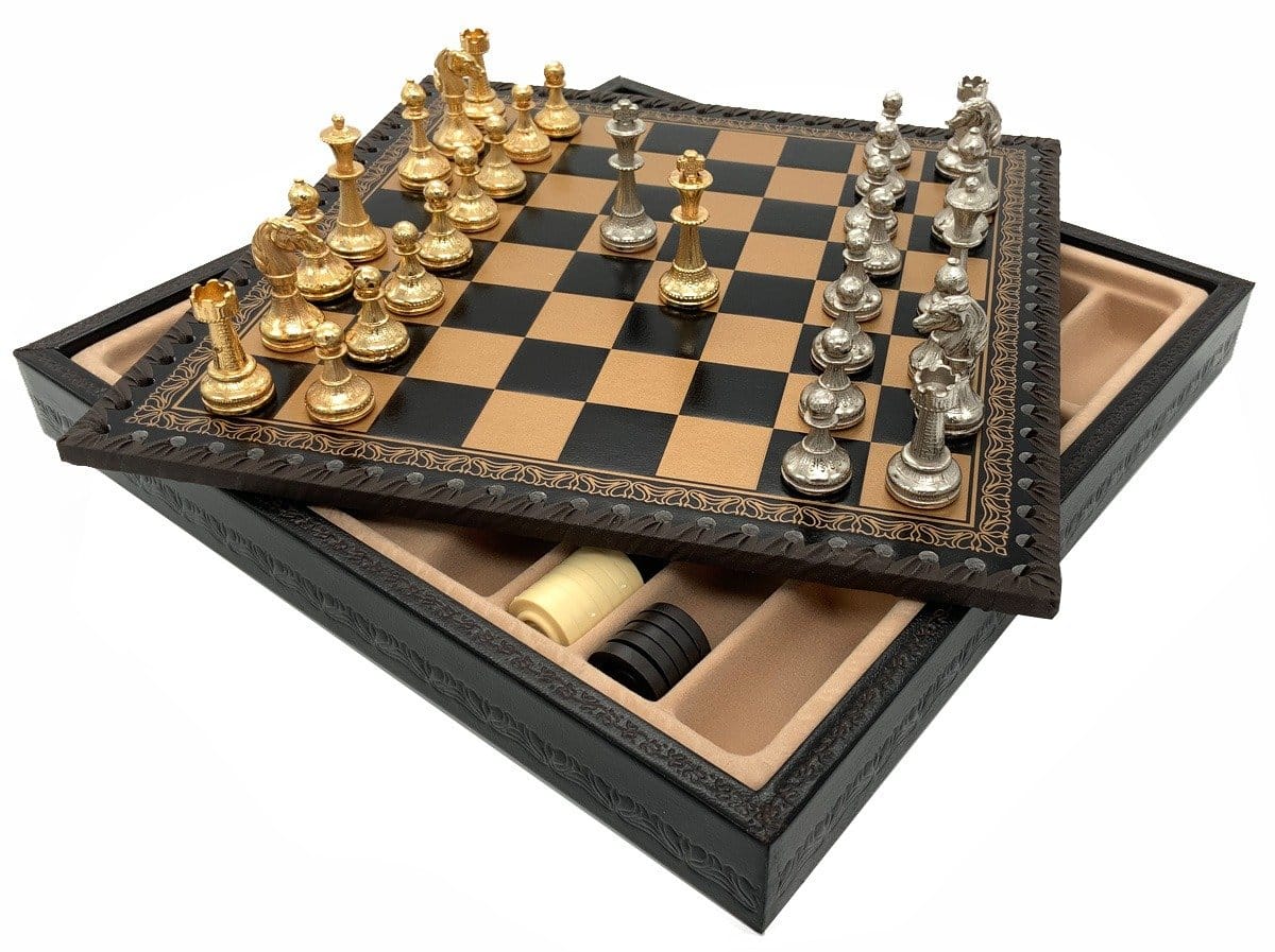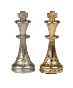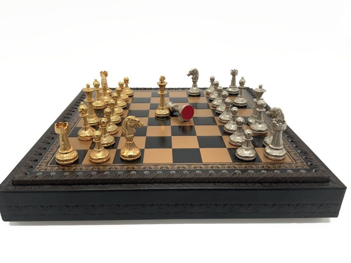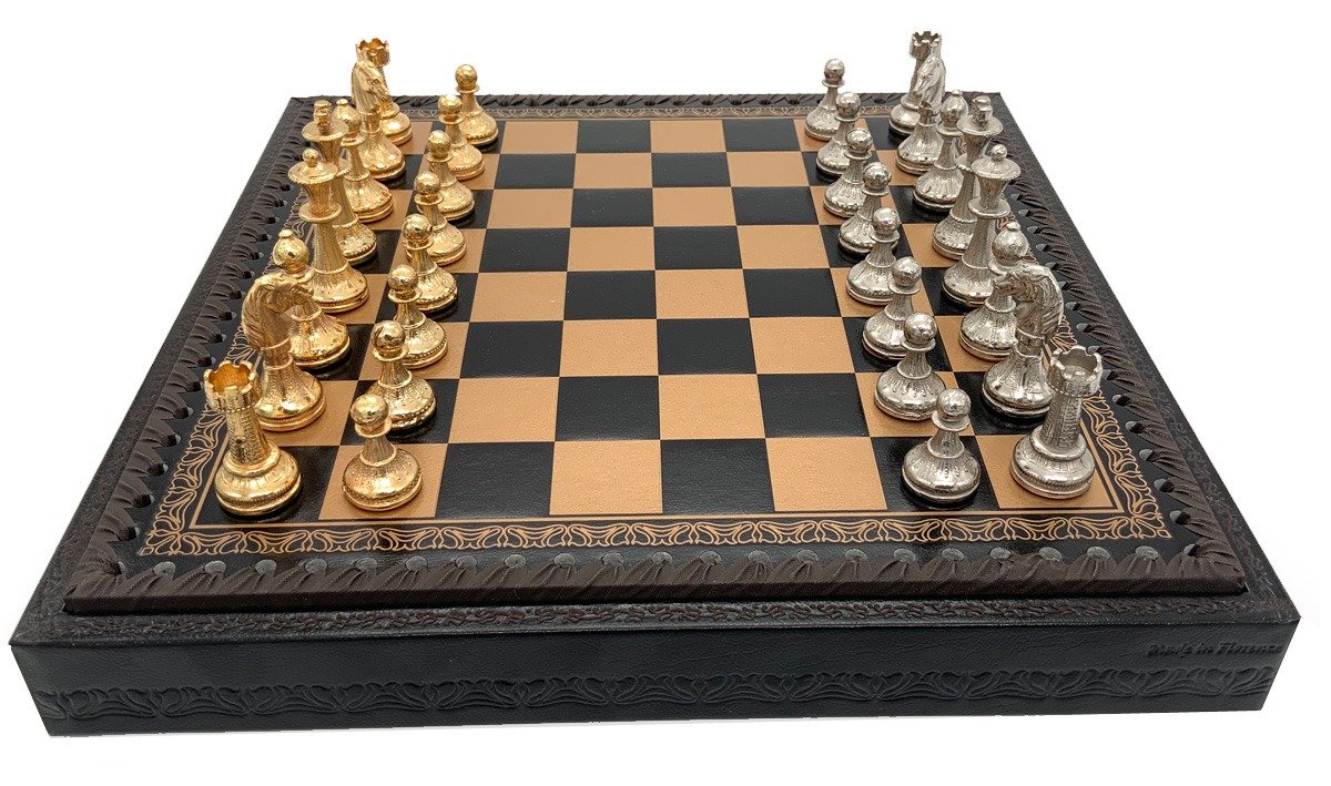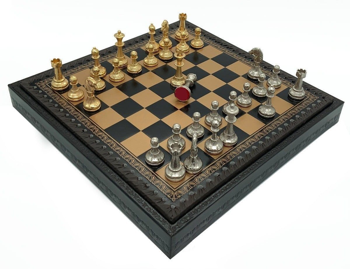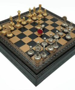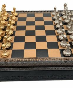 L’Ensemble Mignon Flower V Echiquier avec Rangement et Jeu d’Echecs Métal Plaqué Or et Argent est une combinaison parfaite d’élégance et de fonctionnalité. L’échiquier est fait à la main avec du similicuir de qualité supérieure et est teinté en noir. Il mesure 28 x 28 x 3,5 cm avec des cases de 2,8 cm et est doté d’un rangement intégré et feutré. Les pièces du jeu d’échecs sont en métal plaqué or et argent et sont finies à la main avec un polissage et une finition plaquée or et argent. Le roi mesure 4,8 cm de haut avec une base de 1,9 cm et il y a 32 pièces au total. Ces produits sont fabriqués en Europe, garantissant la plus haute qualité. Offrez-vous une combinaison unique d’élégance et de
