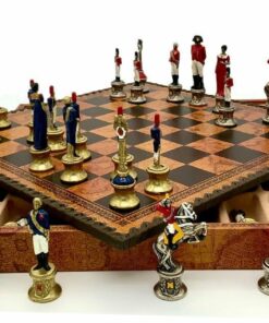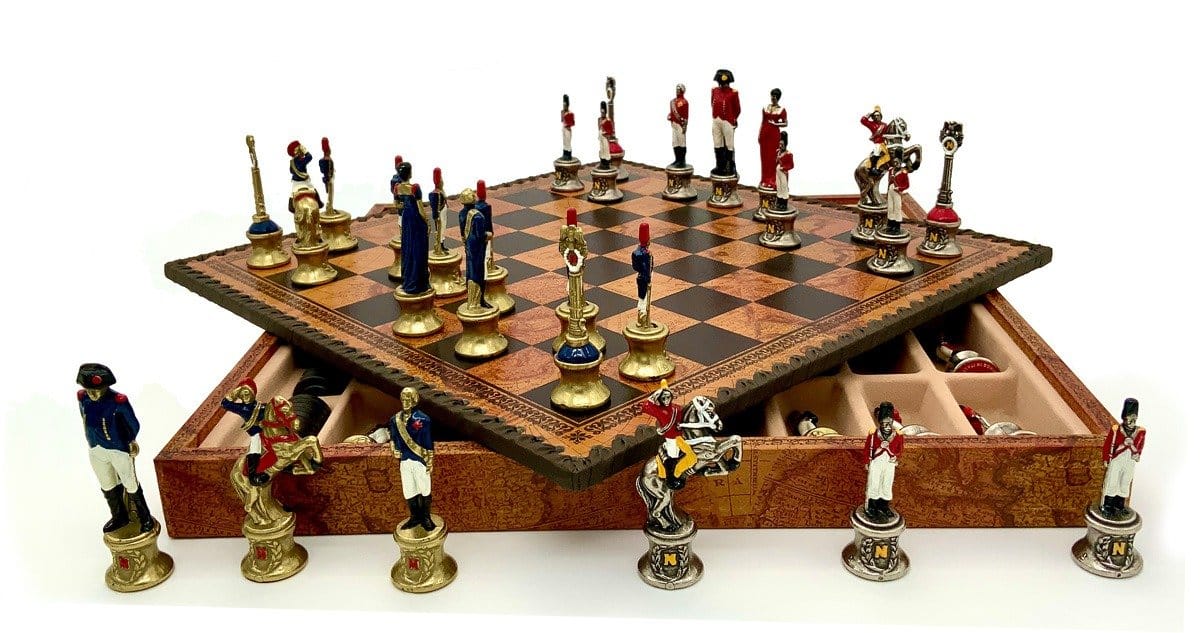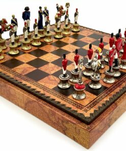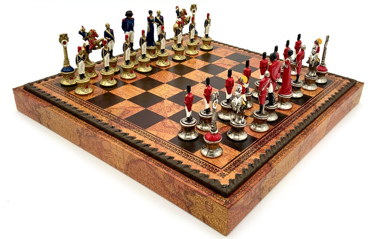 Ensemble d’Echecs Napoléon III avec Echiquier en Similicuir Ancien Monde et Jeu en Métal Peint à la Main