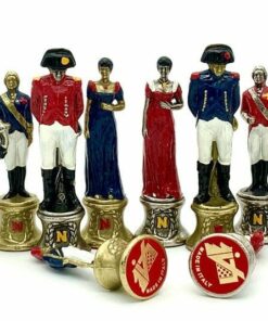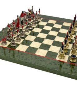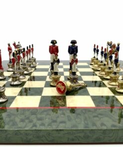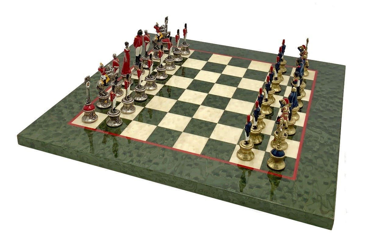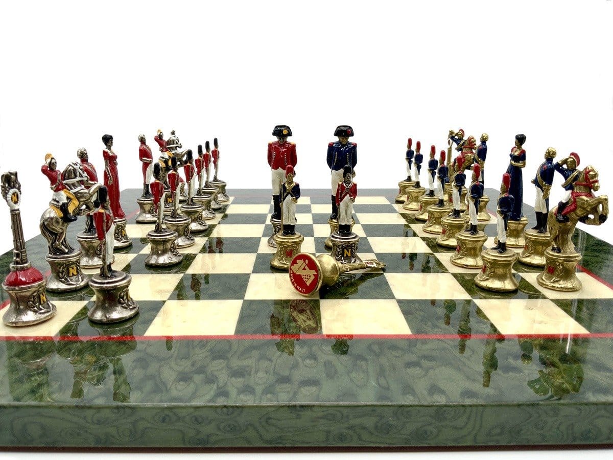 Ensemble d’Echecs Napoléon III Haut de Gamme: Echiquier en Bois d’Erable Vert Marbré Brillant avec Jeu d’Echecs en Métal Peint à la Main
