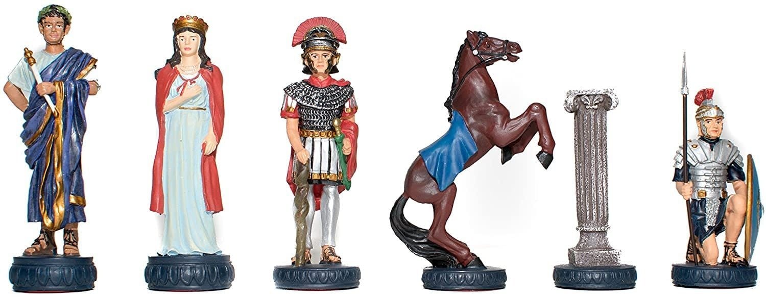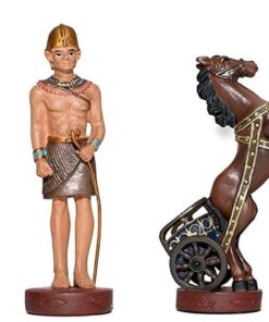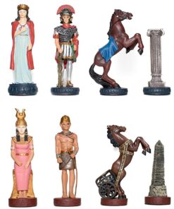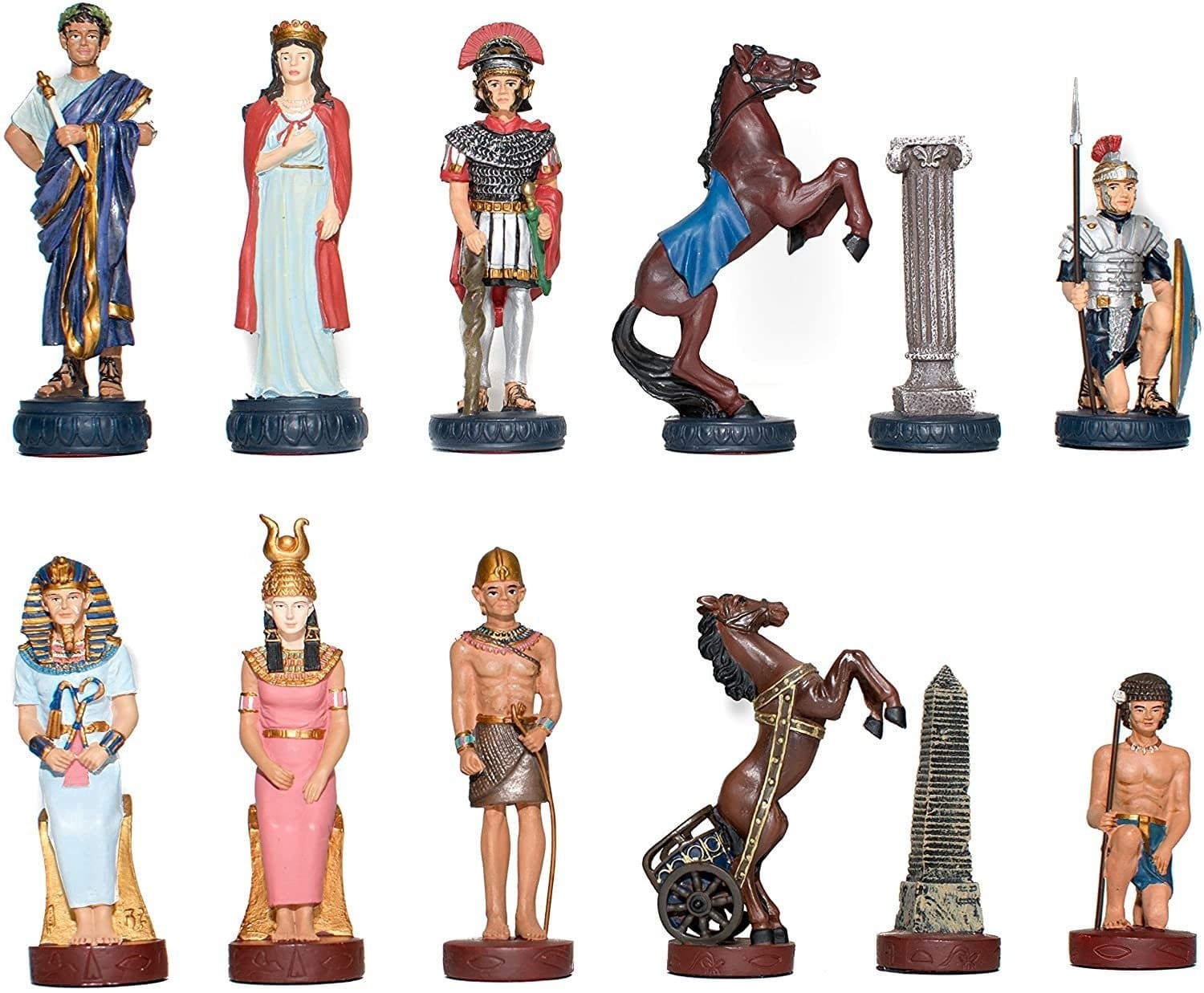 Ensemble Echecs Romains vs Egyptiens II: Echiquier en Bois et Jeu d’Echecs en Etain Peint à la Main