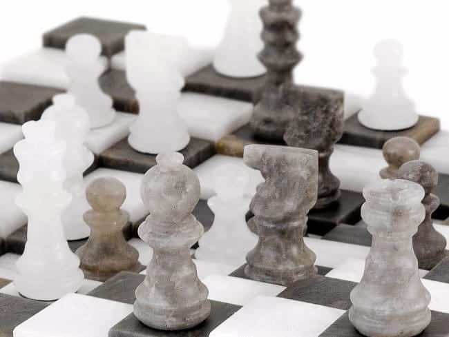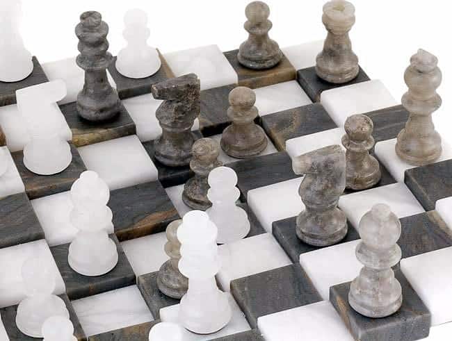 Ensemble Echiquier 3D et Jeu d’Echecs en Marbre Antique – Gris et Blanc