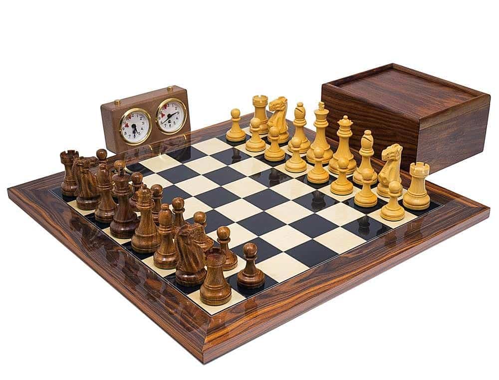 Ensemble Echiquier en Bois et Racine de Palissandre, Horloge Hydraulique et Coffret de Rangement en Bois de Rose Doré, Idéal pour Jouer aux Échecs – Broadbase Club