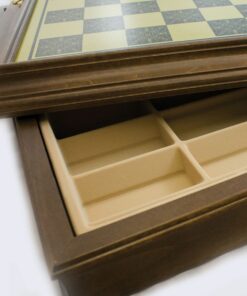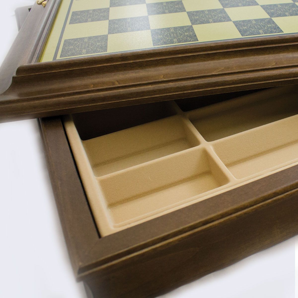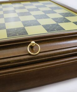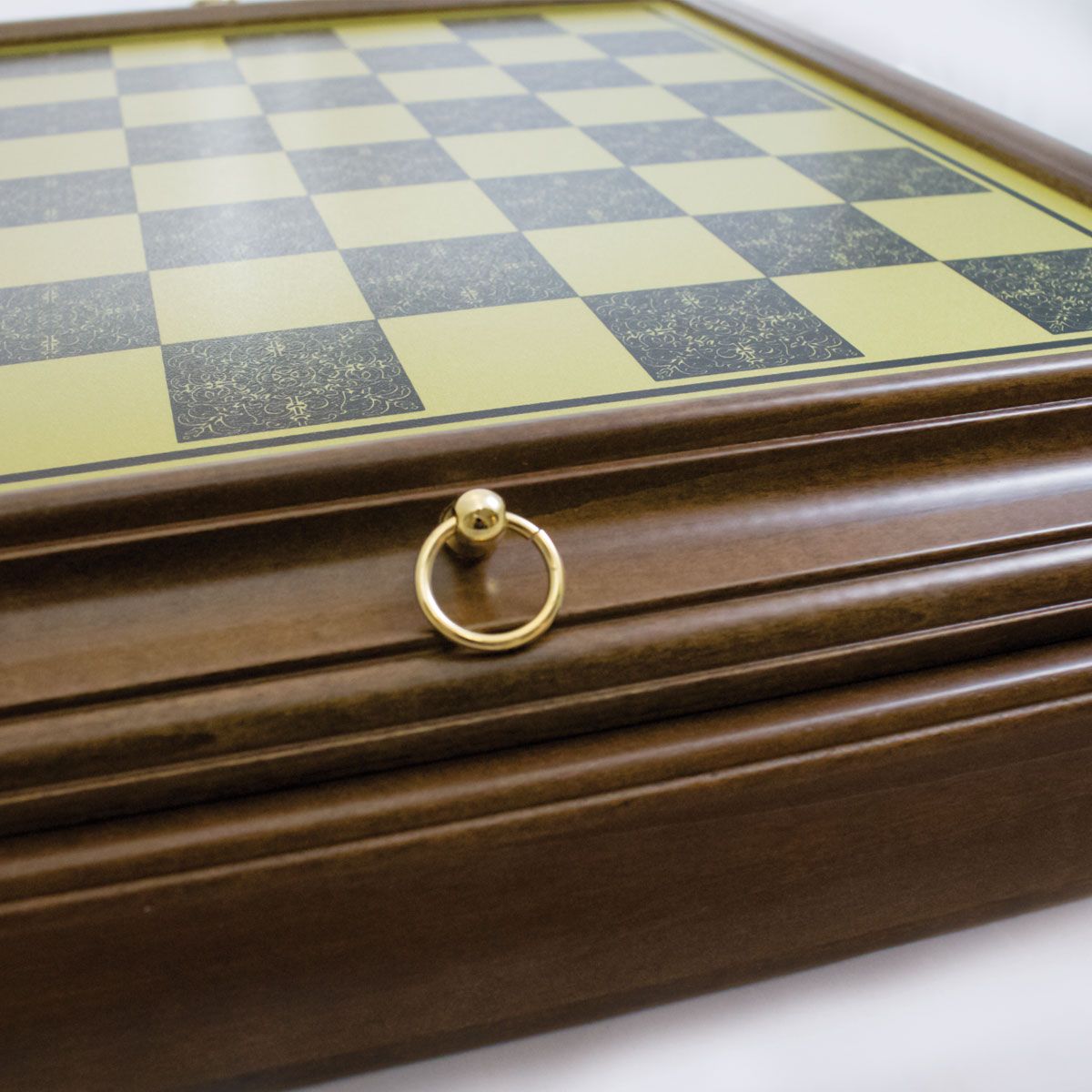 | finition | Rangement intégré à l'échiquier, individuel et feutré, plateau effet laiton, fait à la main |