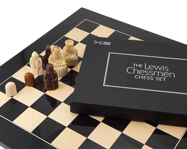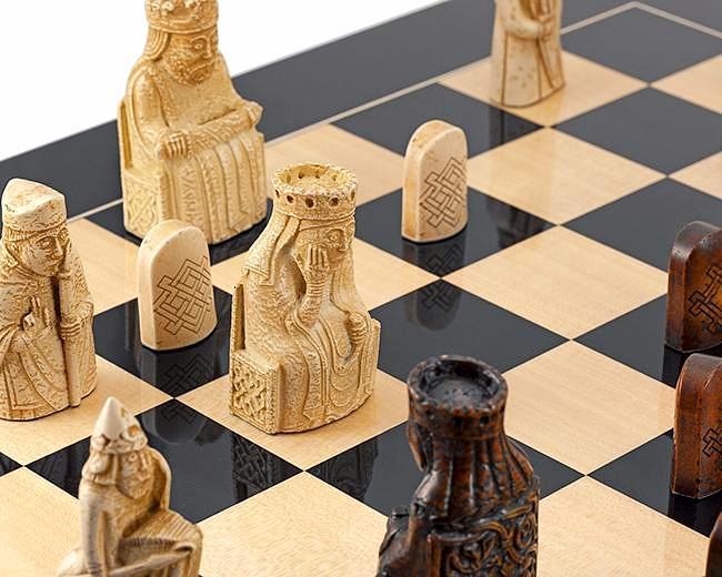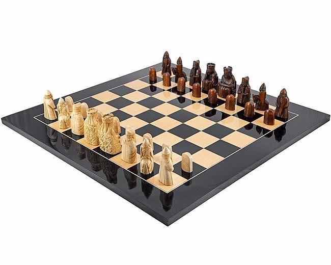 Ensemble Ile de Lewis Echiquier en Bois Massif Laqué et Jeu d’Echecs en Résine – Le Jeu d’Échecs Idéal pour Toutes les Parties