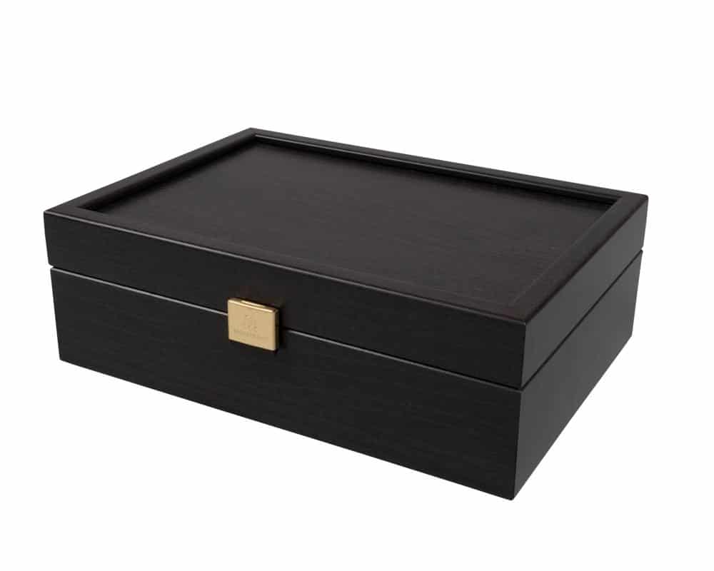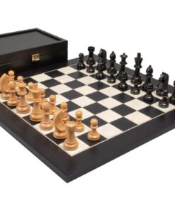 Ensemble Jeu d’Echecs Knight Design en Bois de Peuplier Noir et Erable Blanc, Coffret de Rangement en Bois de Buis Ebonisé