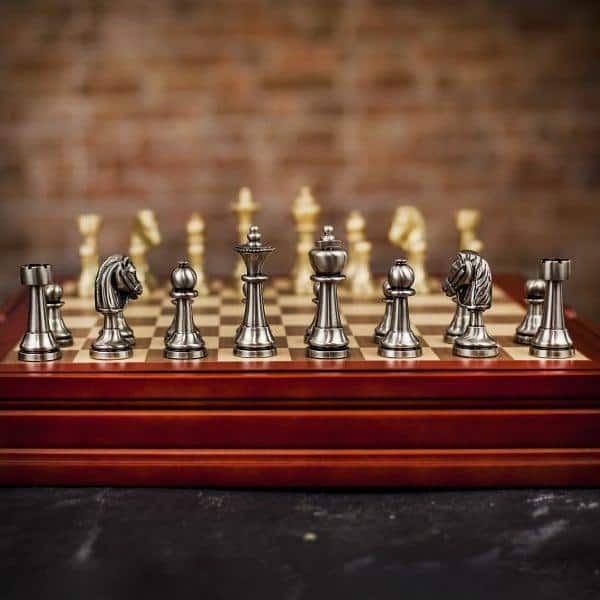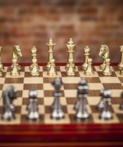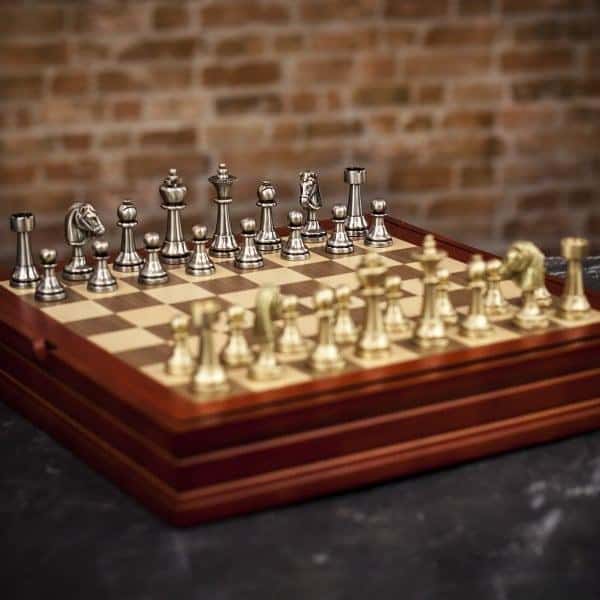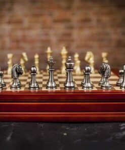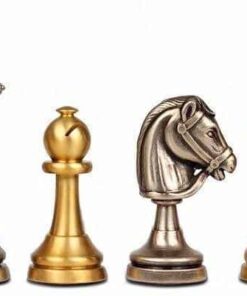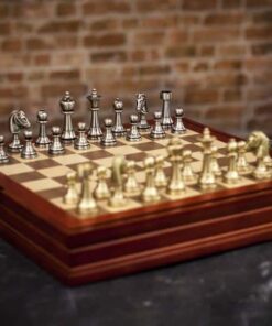 L’ensemble Staunton Echiquier en Bois de Noyer et d’Erable et Pièces d’Echecs en Laiton Massif est un produit haut de gamme, fabriqué en Europe. L’échiquier est fabriqué à la main avec du bois de noyer et d’érable, et mesure 37 x 37 x 5,5 cm avec des cases de 4 cm. Il est doté d’un compartiment de rangement intégré au plateau qui permet de ranger les pièces. Le jeu d’échecs est fait de laiton massif et chaque pièce est sculptée et ciselée à la main. Le roi mesure 7 cm de haut et 2,4 cm de diamètre à la base, et le jeu comprend 32 pièces avec une base en feutre. Tout l’ensemble est réalisé à la main, offrant une finition impeccable et une qualité exceptionnelle. Vous ne serez pas déçu par cet ensemble Staunton Echiqu