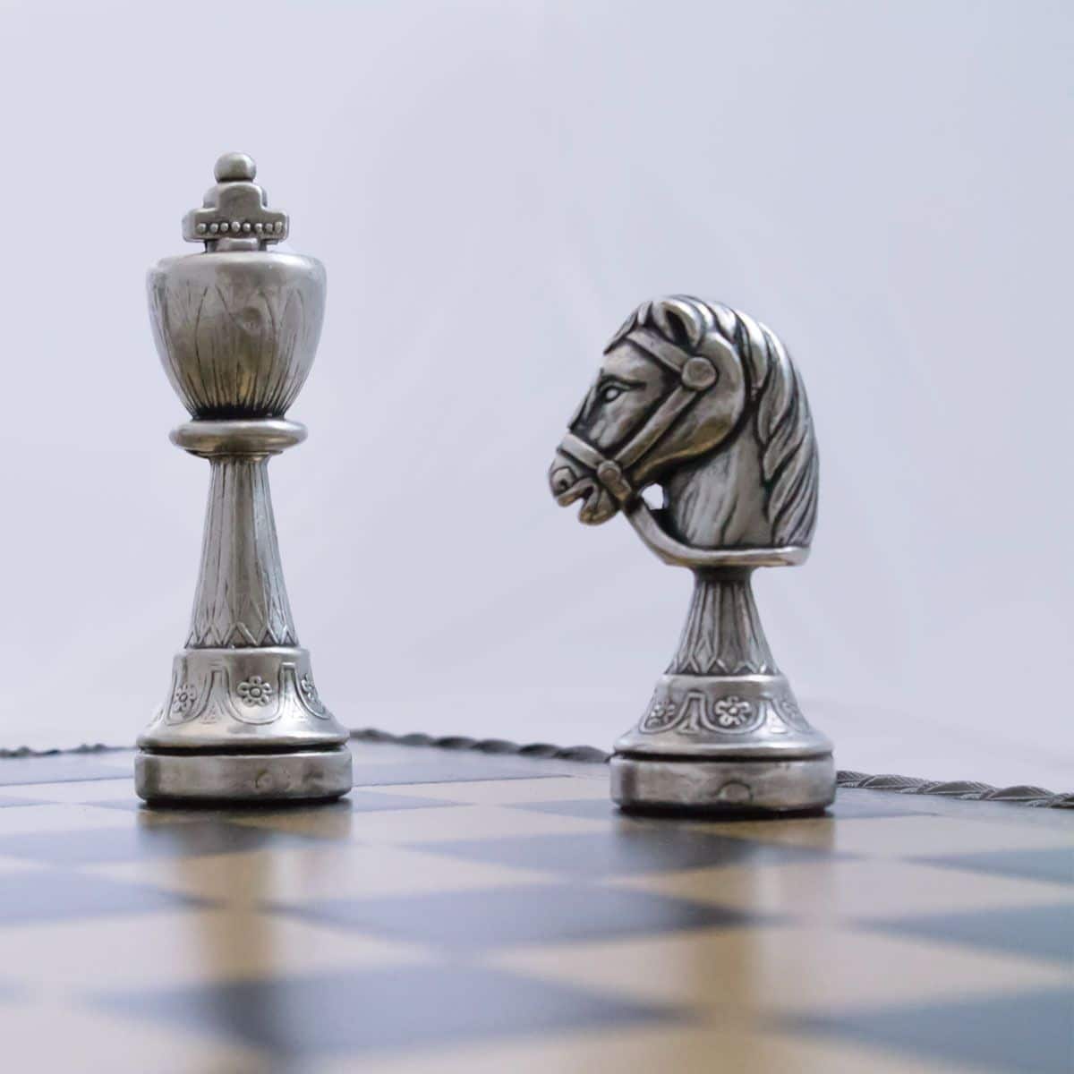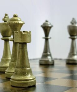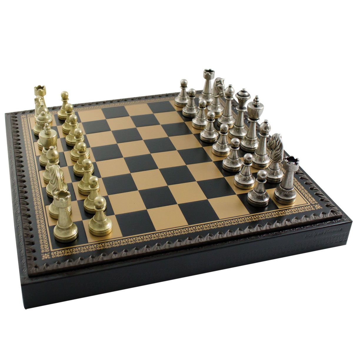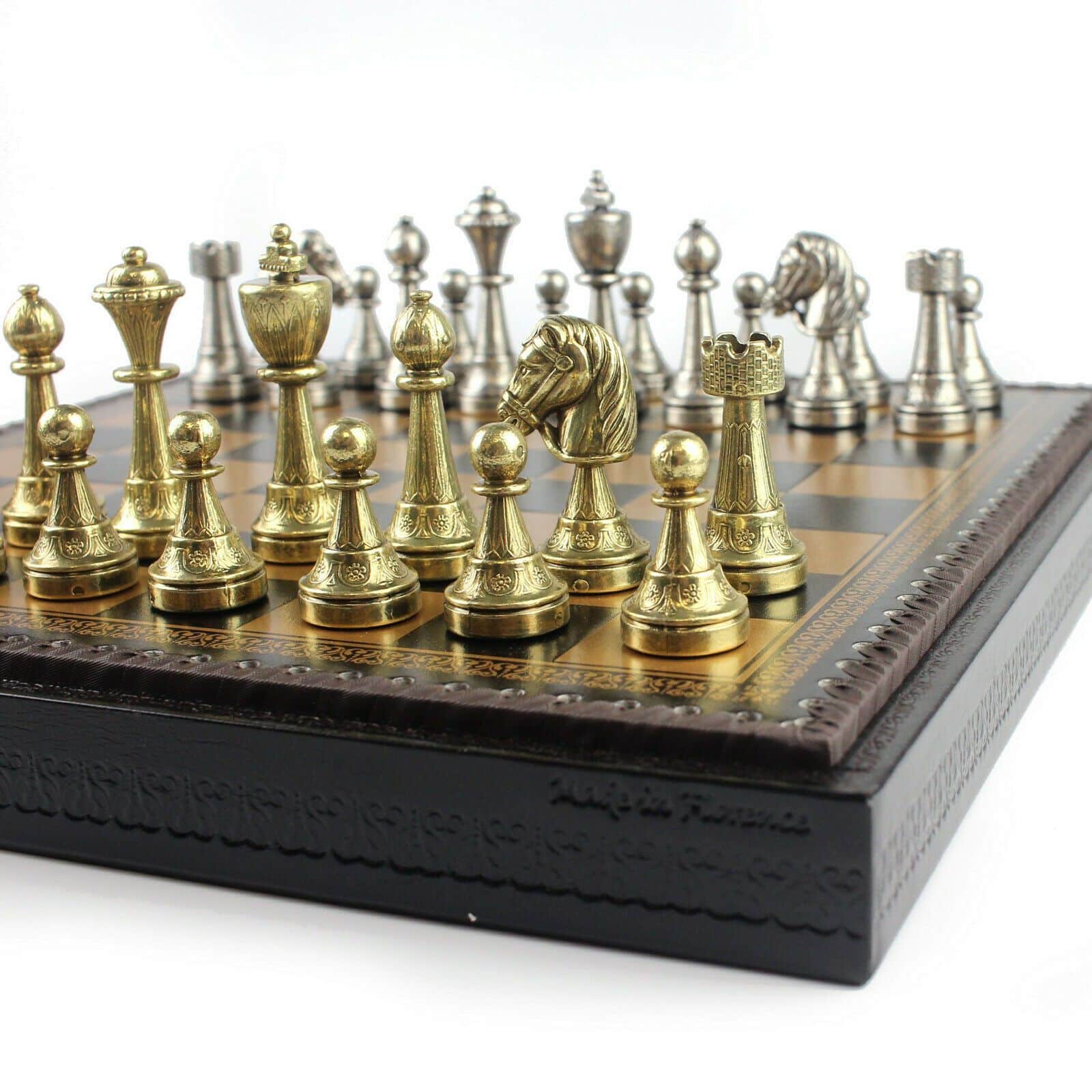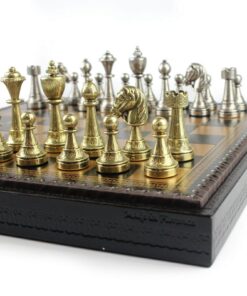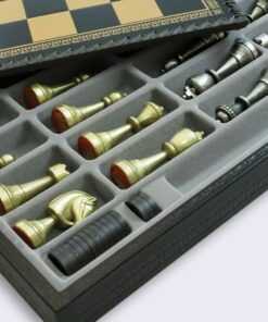L’ensemble Staunton Mix II Echiquier en Similicuir avec Compartiment de Rangement Intégré & Jeu d’Echecs en Métal Massif est une pièce de collection incontournable pour tout amateur d’échecs. L’échiquier est fait avec des matériaux de qualité supérieure, notamment un similicuir teinté noir et une taille de 35 x 35 x 4 cm. Les cases ont une taille de 3,5 cm et le compartiment de rangement individuel permet de ranger le jeu et les pièces en toute sécurité. Le jeu d’échecs est quant à lui fait avec du métal massif et les pièces sont sculptées et ciselées à la main, avec une hauteur du roi de 7,5 cm et un diamètre de base du roi de 2,5 cm. La base est feutrée pour plus de confort. Cet ensemble est fabriqué en Europe avec