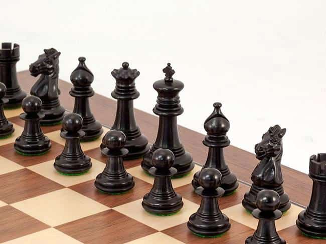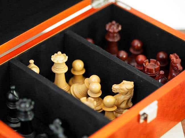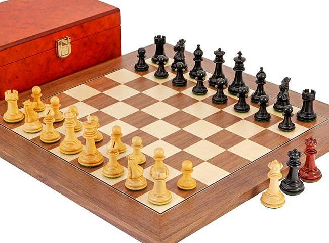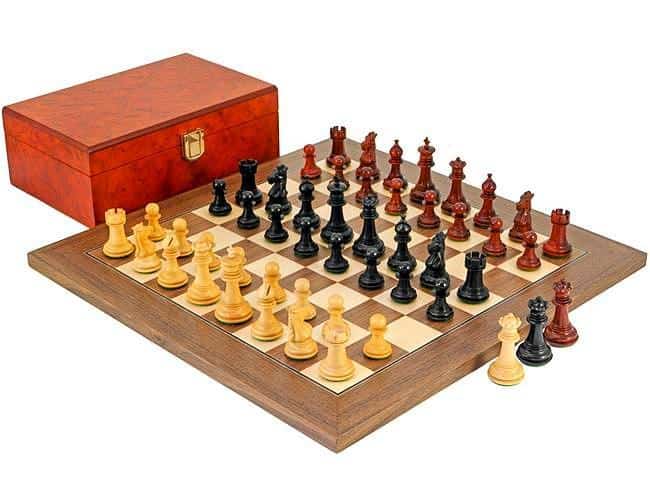 Ensemble Echiquier et Jeu d’Echec Windsor Cocoa Burl en Bois d’Ebène, d’Erable et de Buis