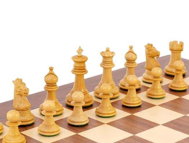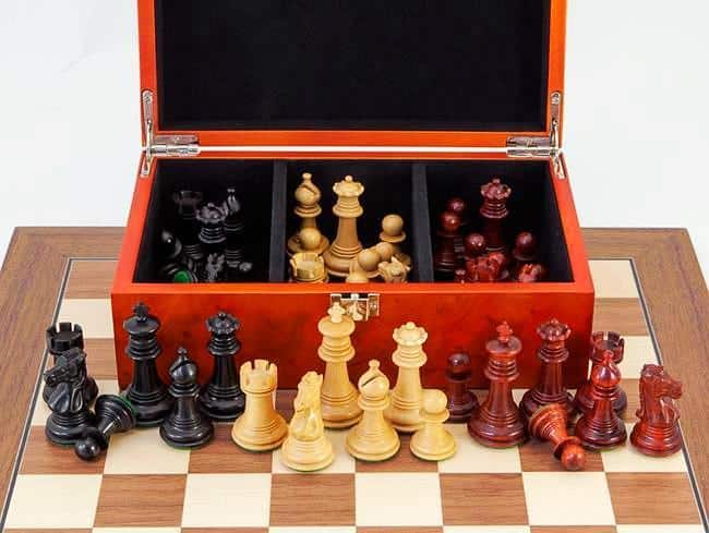 Ensemble Trois Couronnes Echiquier en Bois de Noyer & Erable & 3 Sets de Jeu d’Echecs en Ebène, Padouk et Buis
