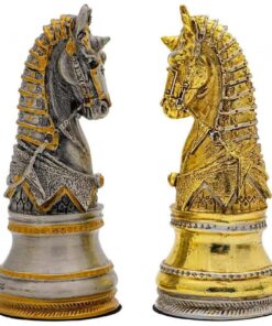Ce jeu d’échecs en étain plaqué or et argent est le parfait cadeau pour passionnés d’échecs. Le buste médiéval est sculpté et plaqué à la main avec un matériau d’étain de qualité supérieure. La hauteur du roi est de 9 cm et son diamètre de base est de 3,5 cm. Le jeu contient 32 pièces fabriquées en Europe, pour une qualité de fabrication sans compromis. Pour compléter votre ensemble, nous vous conseillons d’utiliser un échiquier avec des cases de 5 à 6 cm. Vous obtiendrez ainsi un jeu d’échecs réaliste et luxueux qui s’adaptera à toutes vos parties. Achetez votre jeu d’échecs en étain plaqué or et argent aujourd’hui pour le plaisir et le divertissement sans fin.